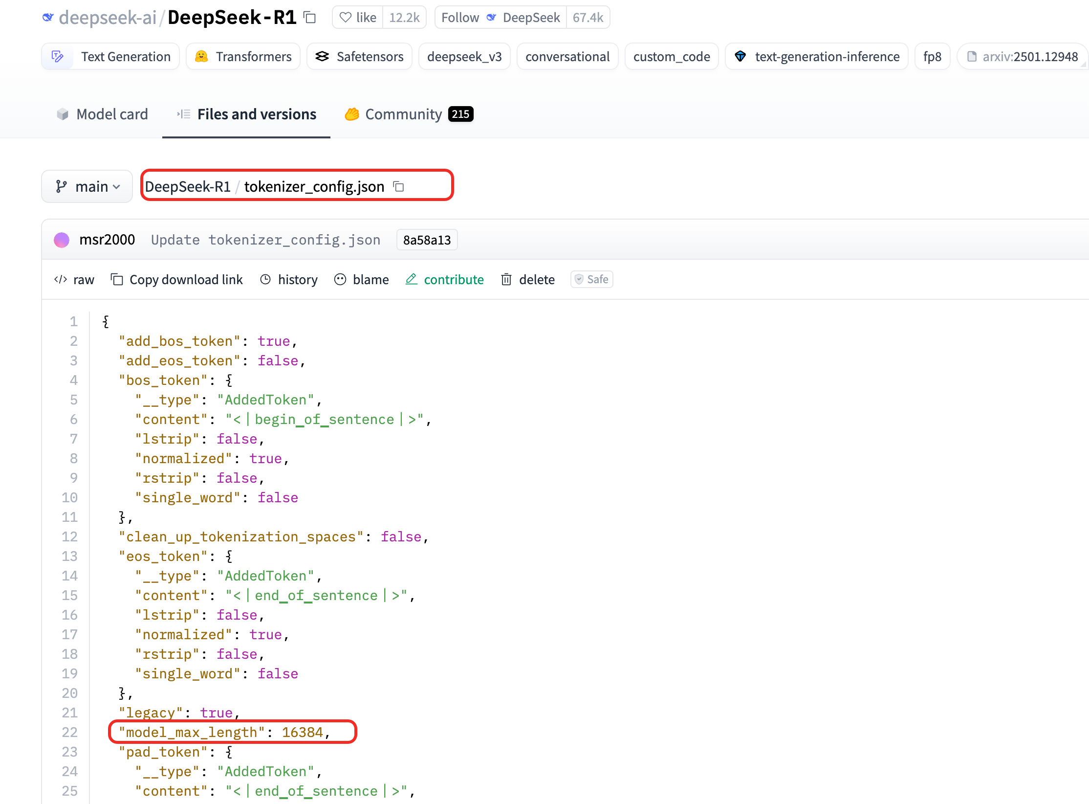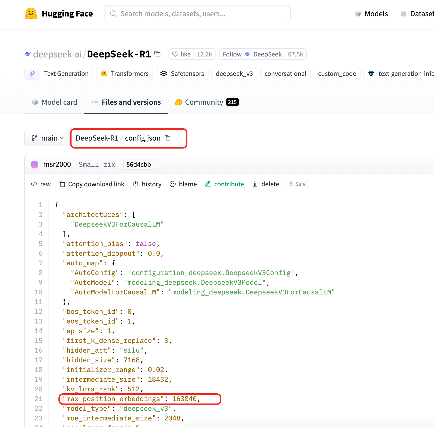 在 huggingface 上面找到 [DeepSeek-R1](https://huggingface.co/deepseek-ai/DeepSeek-R1/tree/main),在config.json中有"max_position_embeddings":163840,如下图所示:
