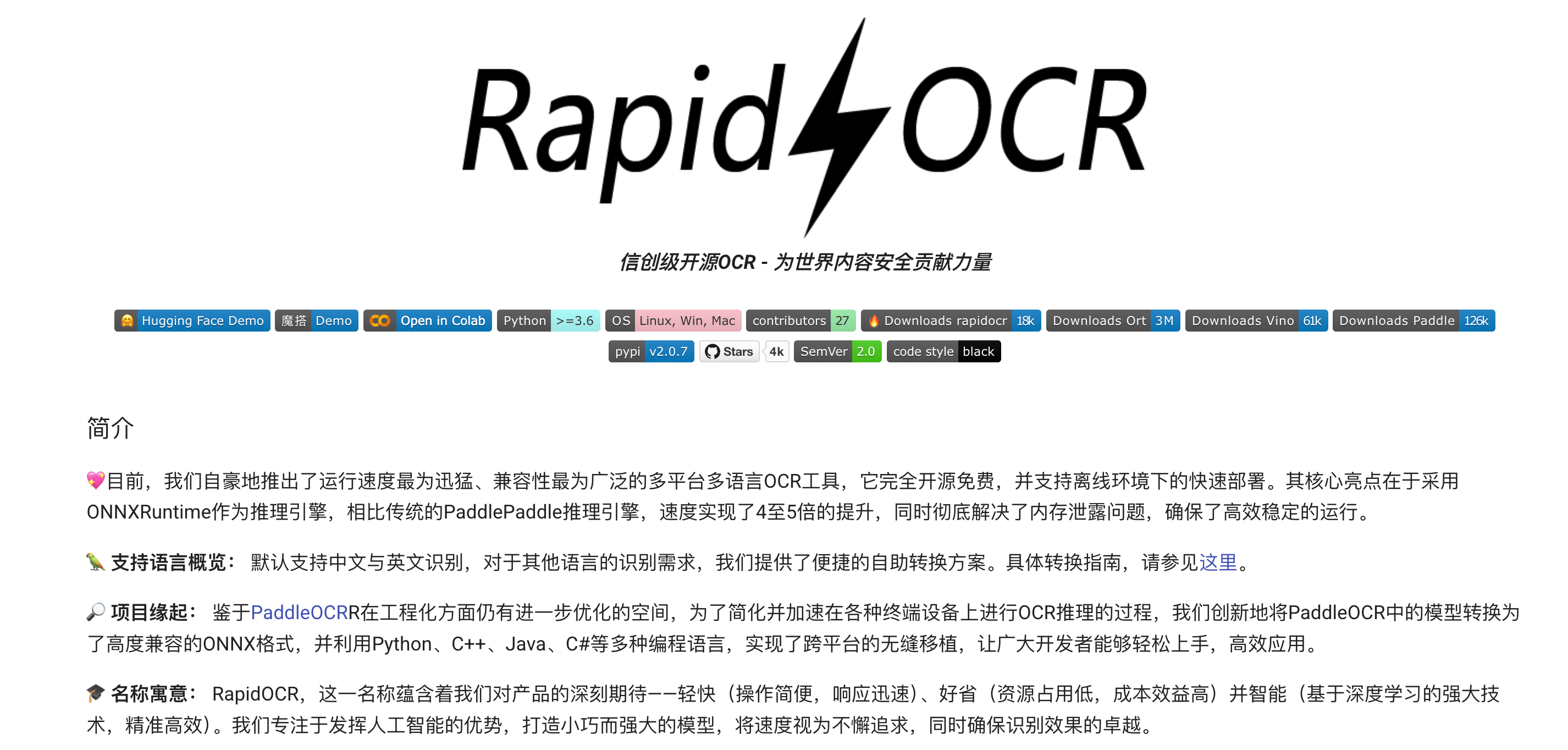 这里选择 RapidOCR 模型和 docling 进行集成,关于 RapidOCR 的介绍如下: