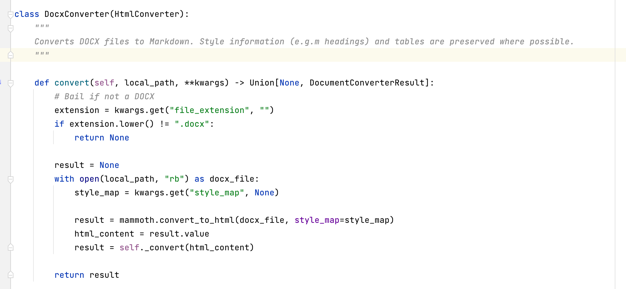 mammoth先转换成html格式,然后使用BeautifulSoup提取html的内容,最后转换成markdown格式。微软开源项目,代码质量有一定保障,推荐使用。 - docling: 无法正确转换docx文件的标题和表格。